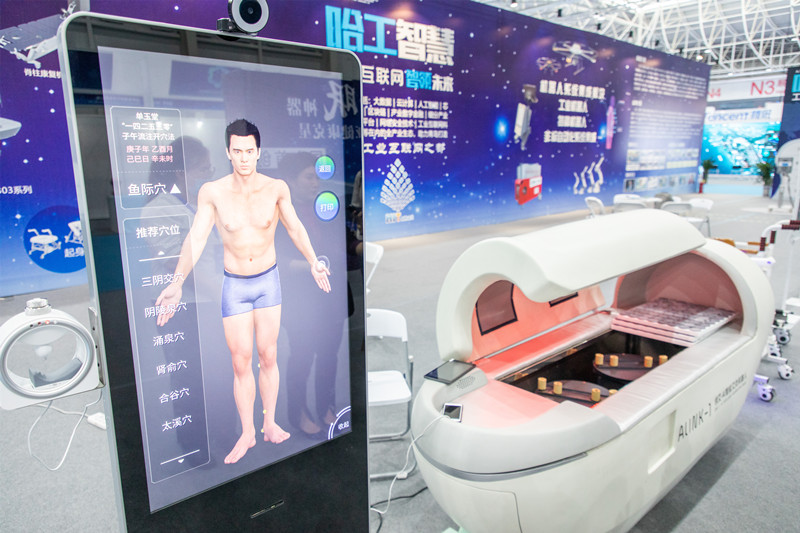 位于海工裝備與海洋科技展區(qū)內(nèi)的哈工大機器人集團展位里,人氣頗旺。哈工(青島)機器人有限公司哈工智慧市場總監(jiān)劉瑛正一邊演示一邊為大家介紹哈工大最新研發(fā)的機器人?!拔覀冏灾餮邪l(fā)了這套中醫(yī)問診系統(tǒng),這款艾灸機器人能夠依托傳感技術(shù)進(jìn)行脈診,并通過圖像分析進(jìn)行面診、舌診,搭配體質(zhì)辯診問題庫,生成報告后傳輸?shù)皆贫诉M(jìn)行數(shù)據(jù)分析,會生成艾灸診療方案,機器人會根據(jù)方案通過點對點穴位為人體進(jìn)行調(diào)理?!?