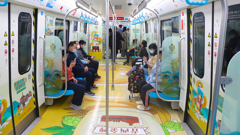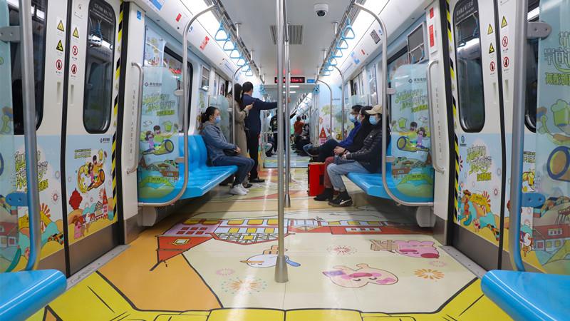 “地鐵專列利用車廂的立體空間,以插畫手繪風為主要設(shè)計風格,將金沙灘啤酒城IP形象——‘哈舅’作為靈魂人物,帶領(lǐng)乘客穿梭于六大主題車廂間,共同感受新區(qū)魅力,打造了場景化的品牌營銷,帶給乘客沉浸式體驗。”黃發(fā)集團策劃部工作人員趙益弘介紹。