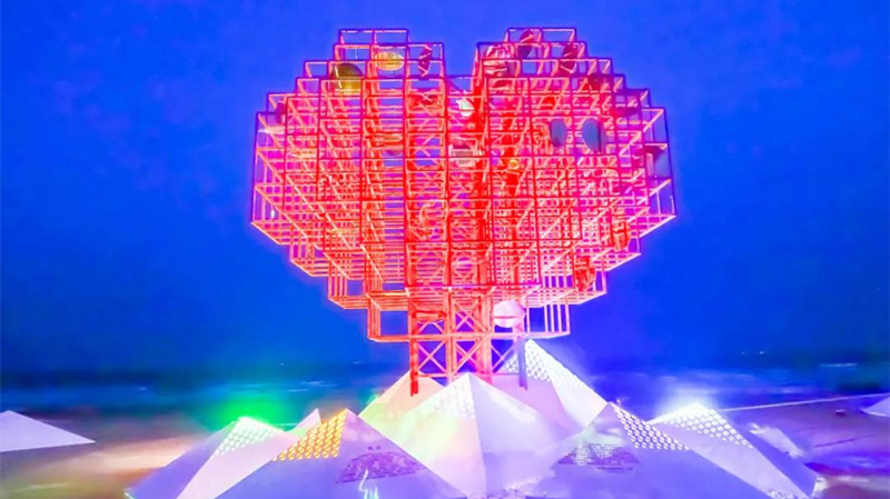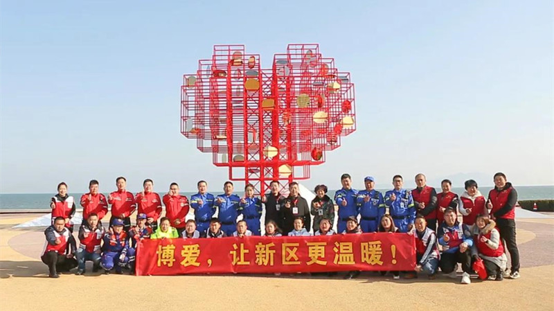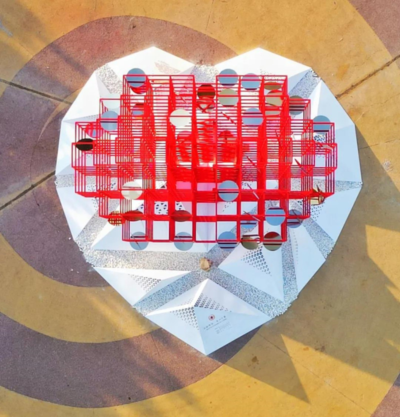 該雕塑位于城市陽(yáng)臺(tái)景區(qū)原海螺廣場(chǎng),距風(fēng)河入??诒卑都s400米,背靠會(huì)展公園,與靈山島隔海相望。采用動(dòng)態(tài)雕塑形式,主體結(jié)構(gòu)為愛(ài)心狀,內(nèi)部由一片片可以風(fēng)動(dòng)的鏡面不銹鋼組成,猶如多顆“愛(ài)心”爭(zhēng)相簇?fù)恚粡目罩懈╊?,亦成“心”形,寓意“?ài)心匯聚”。側(cè)面呈紅十字狀,底座呈山形,與風(fēng)河、大海相呼應(yīng),象征“山海情深”。作品整體與環(huán)境相融,實(shí)現(xiàn)“山海情深、愛(ài)心匯聚”的詩(shī)意表達(dá),與紅十字“人道、博愛(ài)、奉獻(xiàn)”精神完美契合,展現(xiàn)了新區(qū)人民熱心公益、崇德向善的社會(huì)風(fēng)尚和勇立潮頭、積極向上的精神風(fēng)貌。