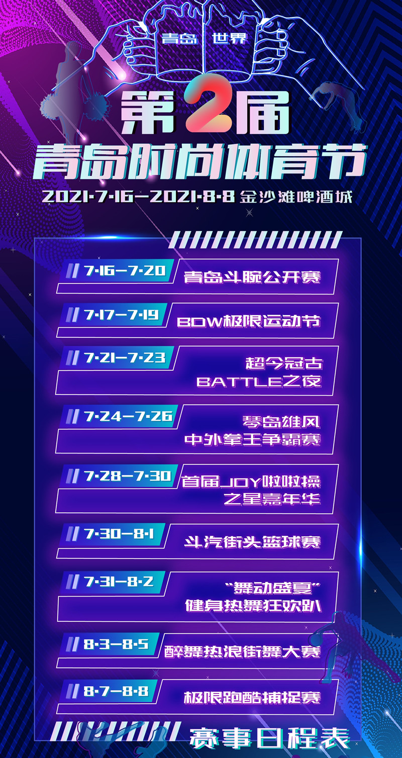 7月16日-8月8日,第31屆青島國際啤酒節(jié)將在青島西海岸新區(qū)金沙灘啤酒城舉行。屆時(shí),第二屆“時(shí)尚體育節(jié)”將在金沙灘啤酒城舉辦,包含斗腕、極限運(yùn)動(dòng)、拳王爭霸賽、搏克、街頭籃球、街舞、跑酷等9大類賽事30余項(xiàng)體育活動(dòng)。與去年相比,本屆體育節(jié)賽事規(guī)格升級(jí)、活動(dòng)多樣、參賽范圍更廣,體育競賽表演更豐富,將為市民游客奉上一場集競技性、觀賞性、參與性于一體的體育盛會(huì)。