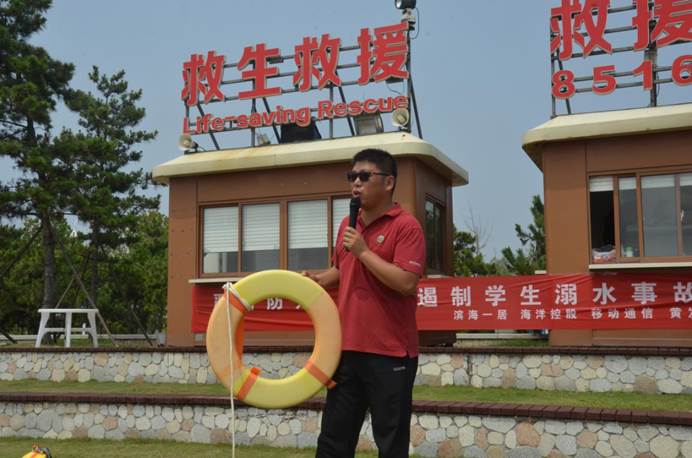黃發(fā)集團(tuán)旅游公司副總經(jīng)理傅元彩講解浴場(chǎng)現(xiàn)場(chǎng)游玩注意事項(xiàng)