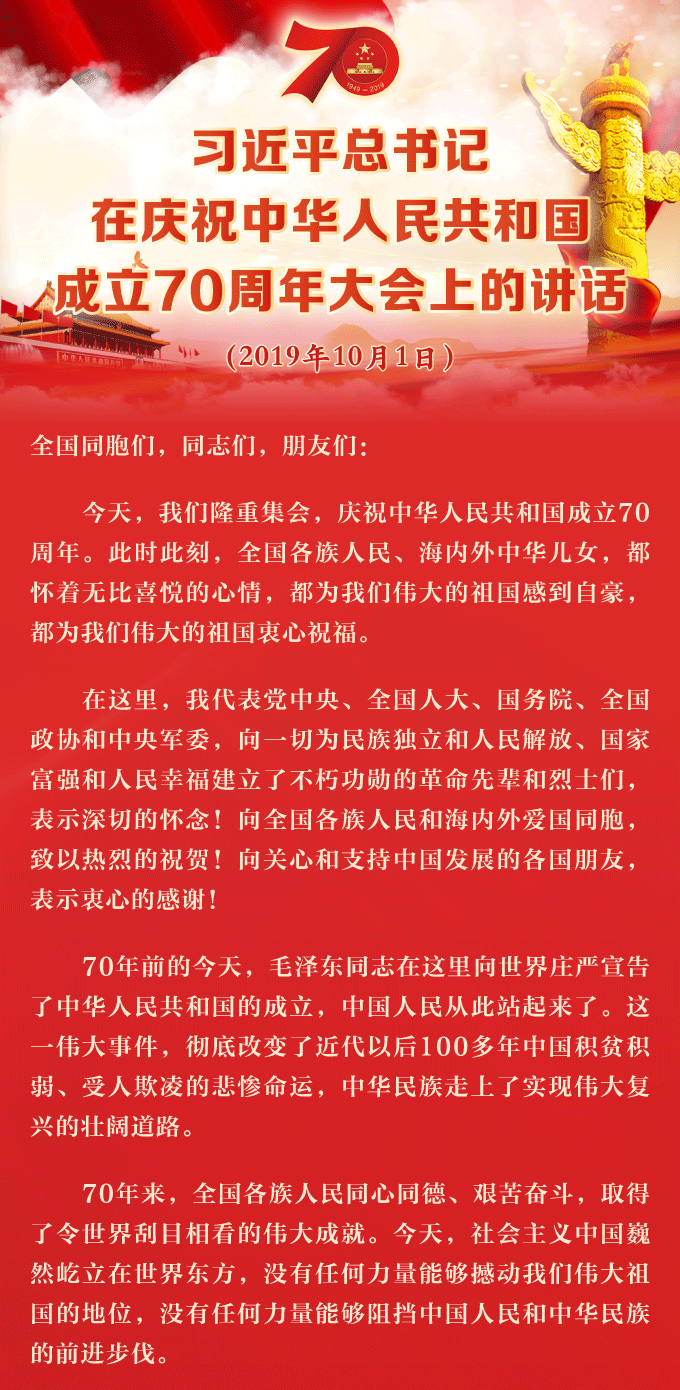 習(xí)近平總書記在慶祝中華人民共和國成立70周年大會上的講話全文